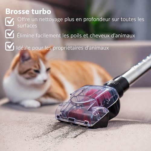 Idéal pour aspirateur poil de chien grâce à la turbo-brosse. Il s’agit d’une brosse polyvalente capable de venir à bout de toutes les saletés. Elle permet de se débarrasser de 80 % de la saleté dans le même temps d’aspiration que les brosses traditionnelles.