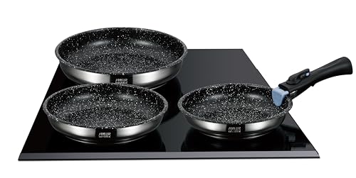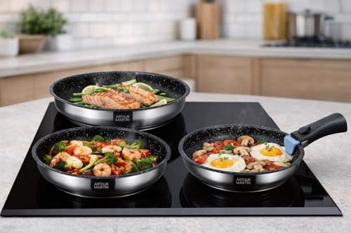 Arthur Martin AM9728 Set de 3 poêles avec revethement anti adhérent Acier Inoxydable Poignée amovible Tous feux dont induction