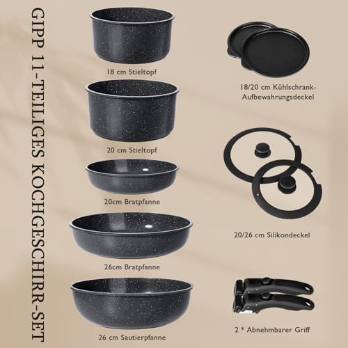 GiPP Set de Casseroles et Poêles en Céramique Antiadhésif – 11 Pièces avec Poignées Détachables, Sans Produits Toxiques, Compatible Induction, Four et Lave-vaisselle(Gris 11PCS)