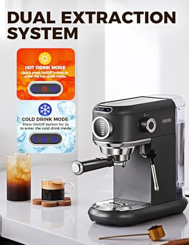 ☕【Mode d’extraction à froid/à chaud】 La machine à café expresso à dosettes dispose de modes à froid ou à chaud, vous permettant de préparer du café glacé en été et du café chaud en hiver. (Le mode CHAUD nécessite un temps de préchauffage d’environ 35 secondes).