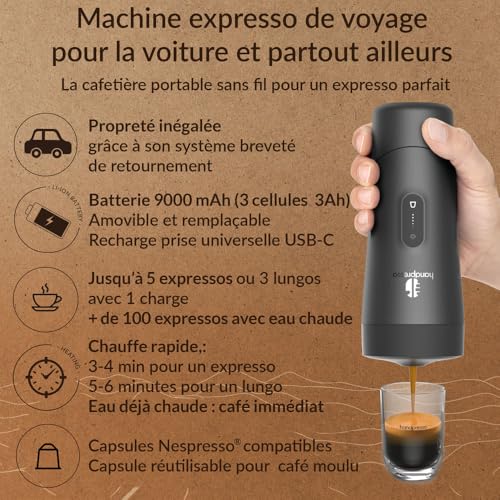 Handpresso Auto | Machine à café expresso portable 19 bars pour voiture et voyage | compatible capsule expresso/capsule réutilisable | Cafetière de voyage compacte, sans fil et rechargeable USB-C