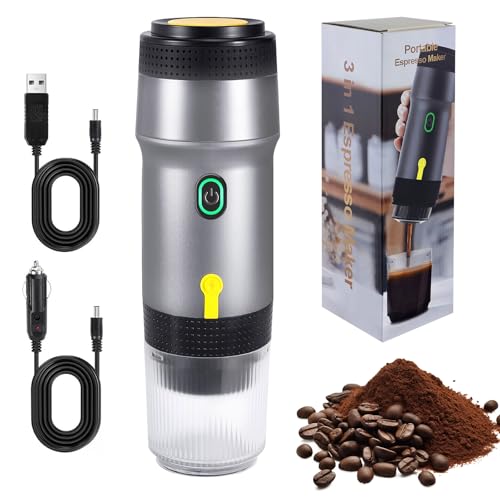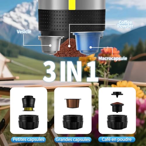 Machine à café Portable 3 en 1, Rechargeable Cafetière Portable de Voyage, 12V Expresso Machine a Cafe pour Capsule, Café Moulu, pour Camping, Voyage, Bureau, Voiture, Maison (Argent)