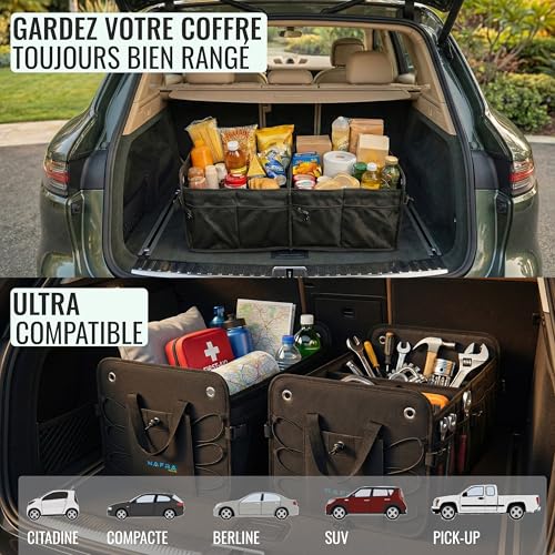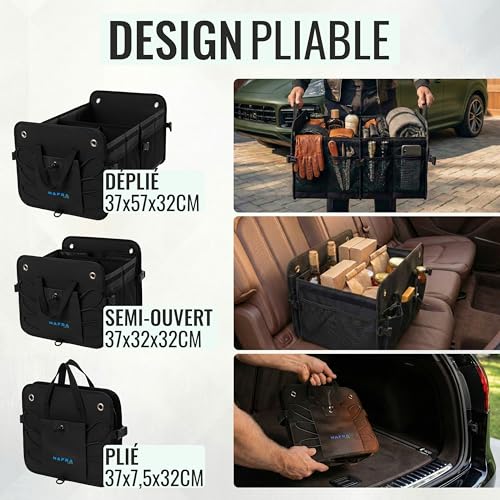 STRUCTURE RIGIDE – FINI LES SACS MOLLES: Contrairement aux organiseurs souples, cet organiseur coffre voiture dispose d’une base et de parois rigides qui conservent toujours leur forme. Aucun affaissement avec le temps. Parfait comme coffre de rangement intérieur, organisateur voiture et produit voiture interieur pour un rangement durable et soigné.