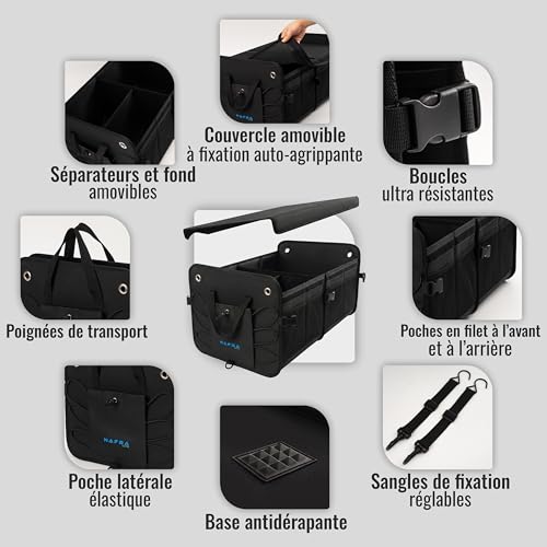 COUVERCLE POUR ORDRE VISUEL ET SÉCURITÉ: Le couvercle avec fermeture par contact protège le contenu de la poussière et des regards, tout en maintenant un coffre propre et organisé. Idéal comme organiseur de coffre de voiture, sac de coffre voiture ou boite rangement voiture pour un rangement coffre voiture discret et sécurisé.
