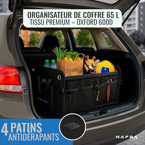 GRANDE CAPACITÉ 65 LITRES ET MODULABLE: Avec 65 litres réels, cet organisateur coffre voiture offre un espace généreux pour accessoires auto, rangement des outils ou accessoires camping car. Les séparateurs amovibles permettent de créer jusqu’à 3 compartiments selon vos besoins. Et lorsqu’il n’est pas utilisé, il est totalement pliable et compact.
