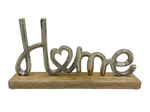 Décoration d’amour/maison sur base en bois. Jolie décoration argentée montée sur support en bois, disponible en deux modèles différents, Love and Home. Dimensions : environ 32 x 19,5 x 5 cm. Fabriqué en aluminium et bois de manguier. Veuillez sélectionner le motif que vous souhaitez, une seule décoration sera envoyée.