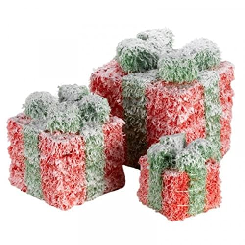 Caractéristiques – Lot de 3 boîtes cadeau rouges givrées. LED blanc chaud. Fonction minuterie 4 heures allumée/20 heures éteinte. 2 piles AA par cadeau (non incluses). Petite taille : 15 x 10 x 10 cm. M : 17 x 15 x 15 cm. L : 23 x 21 x 21 cm. Utilisation en intérieur uniquement