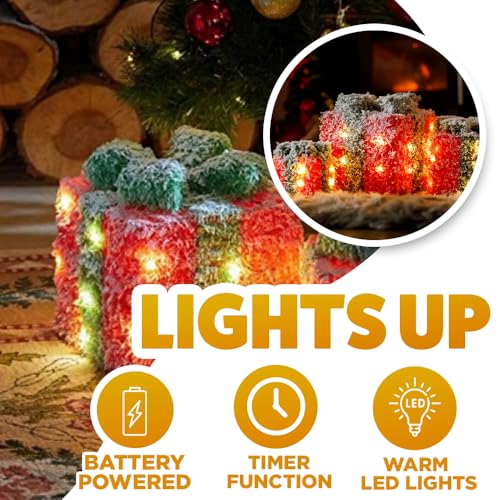 Marco Paul Lot de 3 boîtes cadeau de Noël givrées à LED blanc chaud à piles Décoration festive Cadeau de Noël scintillant
