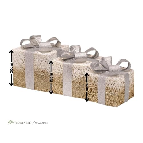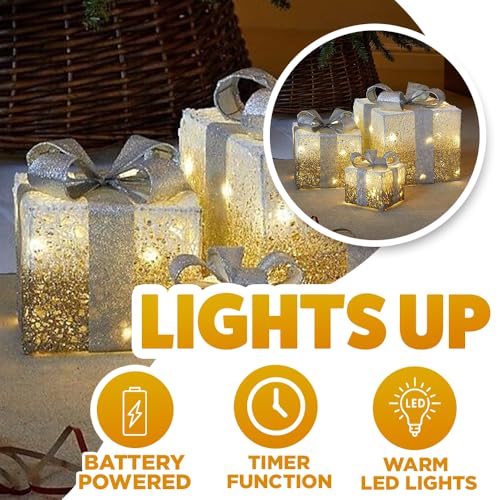 Marco Paul Lot de 3 boîtes cadeaux de Noël givrées pré-éclairées à LED blanc chaud fonctionnant à piles Décoration de Noël scintillante Alimentation par piles Doré et argenté