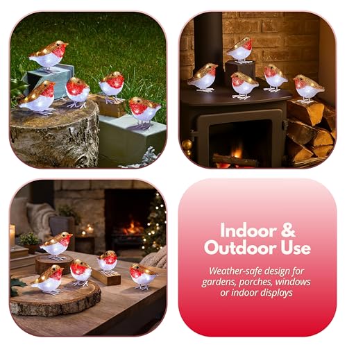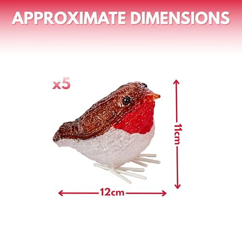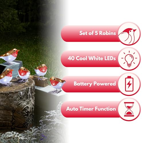 Décoration : égayez votre décoration festive avec ce lot de 5 lumières LED rouge-gorge. Dotées d’ornements en forme d’oiseau rouge avec lumière LED chaude, ces décorations à piles avec minuterie automatique ajoutent du charme à l’intérieur ou à l’extérieur, parfaites pour les fenêtres, les cheminées, les étagères, les jardins ou les présentoirs de vacances.