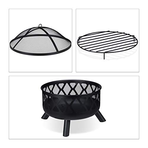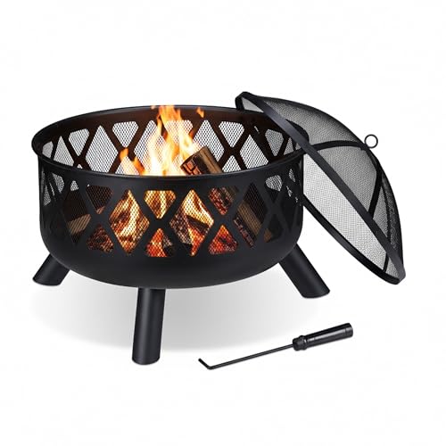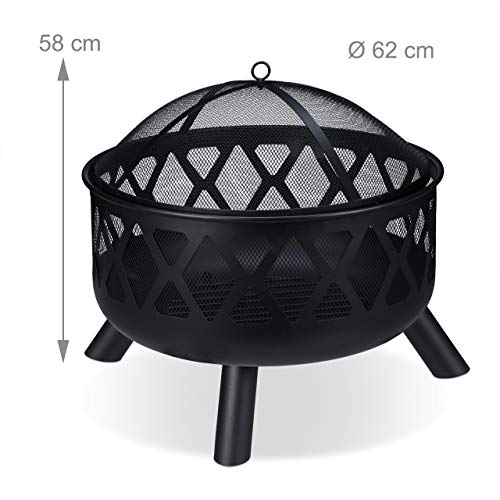 relaxdays Brasero de Jardin, avec Protection étincelles, Ø 62 cm, tisonnier Inclus, terrasse, bac à feu, Acier, Noir