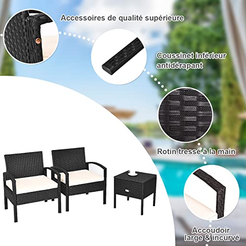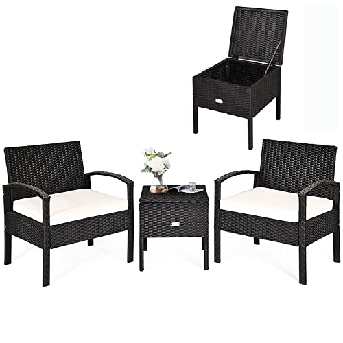 COSTWAY Ensemble de Meubles 3 Pcs de Patio en Rotin Charge 160KG, Salon de Jardin 2 Fauteuils Table Basse Rangement Caché avec Coussins Lavables Accoudoirs pour Jardin Balcon (Beige)