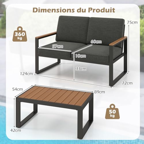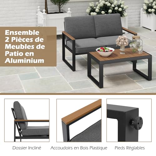 COSTWAY Salon de Jardin 2 Pièces avec Table Basse Causeuse, Ensemble de Meubles d’Extérieur en Aluminium avec Accoudoirs et Plateau en Bois-Plastique Canapé Rembourré, pour Patio Balcon