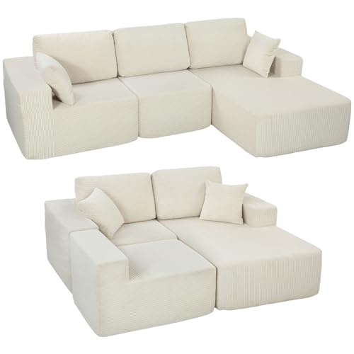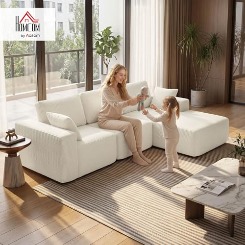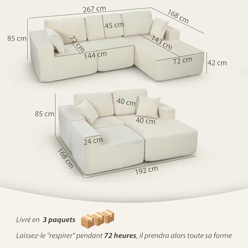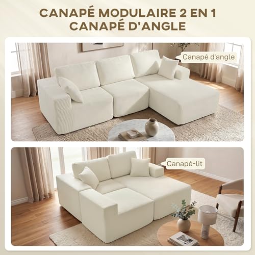 HOMCOM Canapé d’angle modulable 2 en 1, 267cm, canapé-lit 3 places en velours côtelé, larges assise et accoudoirs, 2 coussins, sofa moderne pour salon, bureau, appartement, aucun montage requis, crème | Canapé-lit modulable
