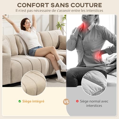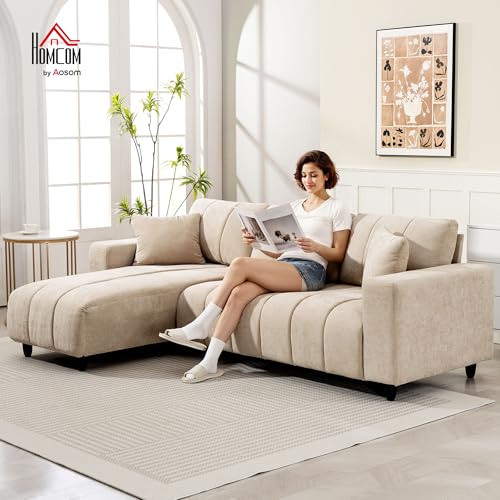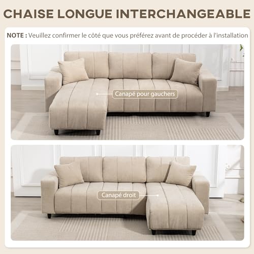 HOMCOM Canapé d’angle réversible, 242 cm, canapé 3 Places modulaire, méridienne, 2 oreillers, Coussin à Ressorts, Assise intégrée, Cadre en Acier, Tissu Aspect Lin, pour Salon, Petit Espace, Beige