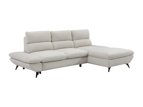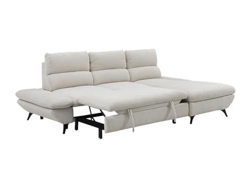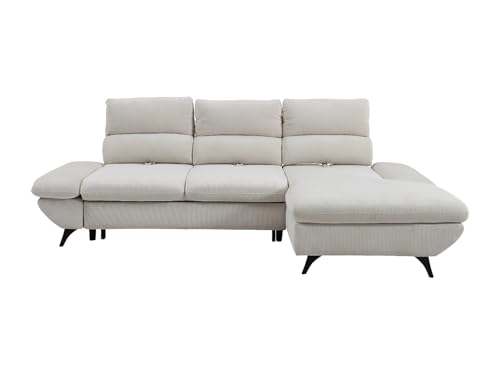 Canapé d’angle droit convertible en velours côtelé beige. Coffre de rangement intégré. Dossier avance-recule. Accoudoirs ajustables. Douceur du velours côtelé. Praticité et simplicité du convertible tiroir. Dimensions : L282 x P196 x H100 cm LIORI