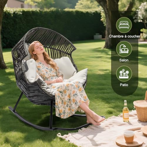 【Conception ergonomique en forme d’œuf】 Notre fauteuil à bascule est parfaitement incurvé pour un ajustement parfait et dispose d’un système de coussins confortables qui offre juste le bon soutien. Avec le repose-pieds ajouté, vous serez toujours dans une position confortable et détendue. Que ce soit pour une sieste l’après-midi ou une nuit à observer les étoiles, vous vous sentirez bercé dans une sérénité totale. Balancez-vous doucement dans ce fauteuil œuf confortable qui enveloppe votre corps comme une étreinte chaleureuse.