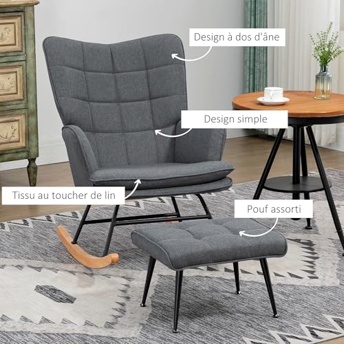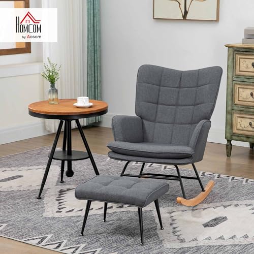 HOMCOM Fauteuil à Bascule avec Repose-Pieds, Rocking Chair en Tissu Aspect Lin, Assise Large, Dossier Haut, Coussin Inclus, Chaise à Bascule pour Salon, Chambre, Gris