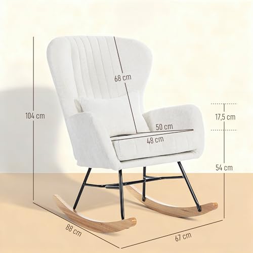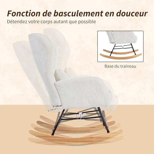 HOMCOM Fauteuil à Bascule, Rocking Chair en Velours, Chaise à Bascule avec Coussin, Assise rembourré, Dossier Haut, accoudoirs, Pieds en Acier et Base en Bois d’hévéa, pour Salon, Chambre, Blanc
