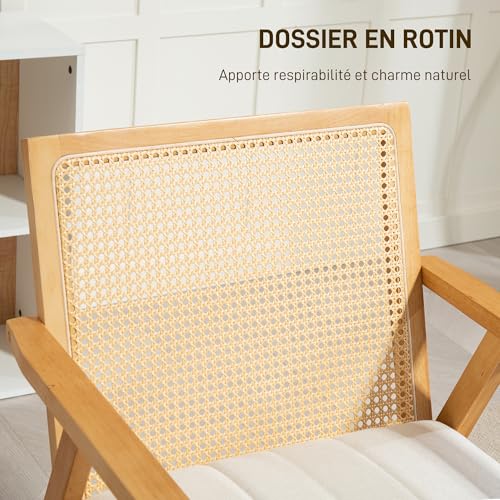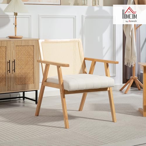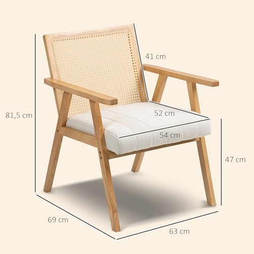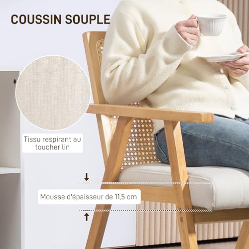 HOMCOM Fauteuil Relax pour Salon Chambre Confortable, Chaise cannage avec Dossier en rotin et Coussin rembourré et accoudoirs, Bois Naturel