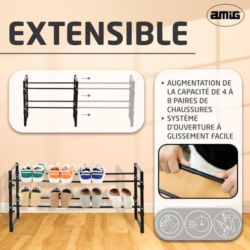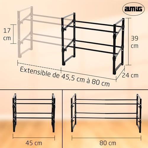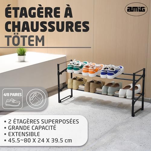 L’étagère à chaussures extensible d’AMIG est une solution polyvalente et ajustable qui s’adapte parfaitement à vos besoins de rangement. Son design réglable permet d’étendre la longueur de 45,5 cm à 80 cm, vous permettant ainsi de ranger facilement entre 8 et 12 paires de chaussures. Idéale pour les entrées, chambres ou placards, cette étagère à chaussures optimise l’espace et aide à maintenir l’ordre dans votre maison. • Dimensions : Réglable de 45,5 cm à 80 cm de longueur • Capacité : Jusqu’à 12 paires de chaussures • Matériau : Tubes en acier avec revêtement en poudre et connexions en plastique PP Caractéristiques : • Ajustable et pratique : Grâce à sa capacité extensible, elle s’adapte facilement à différents espaces, ce qui en fait un choix idéal pour ceux qui recherchent de la flexibilité dans le rangement de leurs chaussures. • Structure stable : Fabriquée avec des tubes en acier de haute qualité et des connexions en plastique PP, cette étagère à chaussures offre stabilité et durabilité, garantissant un rangement sécurisé de vos chaussures. • Montage facile : Grâce à son design léger et son montage sans outils, elle est idéale pour ceux qui recherchent une solution rapide et simple. Design minimaliste et élégant : Cette étagère à chaussures allie fonctionnalité et style grâce à sa structure minimaliste et sa couleur noire élégante, s’intégrant parfaitement dans tout environnement moderne et ajoutant une touche sophistiquée à vos espaces. Engagement qualité : Avec plus de 80 ans d’expérience sur le marché, AMIG propose des produits de haute qualité, conçus pour améliorer l’organisation dans la maison. Cette étagère à chaussures garantit durabilité et style, pour que votre espace reste toujours ordonné. Contenu de l’emballage : 1 x Étagère à chaussures extensible Manuel d’instructions Remarque d’AMIG : Il est déconseillé de laisser les enfants jouer avec ce produit.