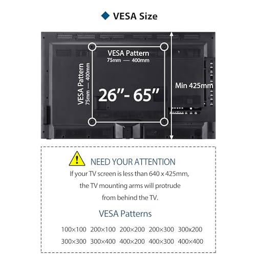 ✅ COMPATIBILITÉ LARGE ET FORTE CAPACITÉ DE CHARGE – Support TV plafond universel conçu pour téléviseurs plats et incurvés de 26 à 65 pouces, y compris 55 et 65 pouces, avec une charge maximale de 45 kg. Normes VESA 100×100 à 400×400, garantissant une fixation fiable et sûre pour divers modèles