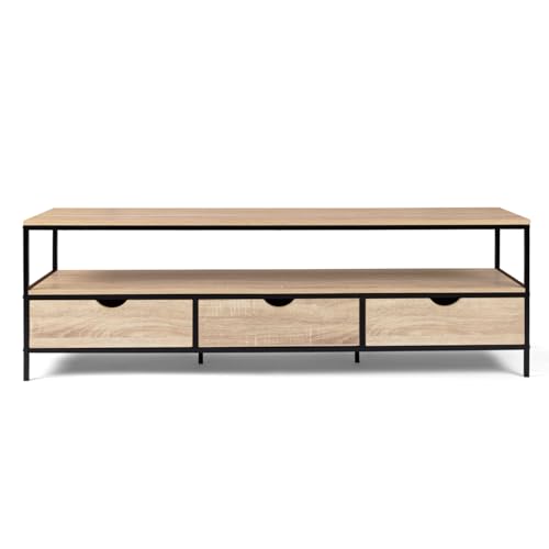 Faites place au style industriel avec le meuble TV 160 cm bi-matière DETROIT en bois et métal. Ses lignes sobres et son style épuré donneront à votre intérieur un aspect loft du meilleur effet.Avec son coloris bois façon hêtre et ses matériaux bruts, votre meuble TV trouvera rapidement sa place chez vous car vous pourrez l’intégrer à différents styles d’intérieurs en renforçant le côté loft ou au contraire en donnant un peu de chaleur à son design.Ce meuble TV bois métal industriel rectangulaire est doté d’un long plateau très pratique en panneaux de particules d’une longueur de 160 cm sur 40 cm de large et d’un compartiment ouvert pour accueillir matériel hi-fi et objets déco !Fonctionnel et élégant grâce à ses trois tiroirs en bois maxi capacité avec poignée à encoche discrète, vous pourrez ranger vos magazines, livres, notices, DVD, Blu-ray et télécommandes !Les 2 plateaux de 160 cm et les 3 tiroirs sont soutenus par une structure métallique qui assure au meuble solidité et stabilité au quotidien.Pratique et déco, cette pièce maîtresse modernisera votre salon !Dimensions du meuble TV 160 cm DETROIT Dimensions globales : Longueur 160 cm x largeur 40 cm x Hauteur 50 cmDimensions des tiroirs : L. 51 x l. 28,5 x H. 15 cmHauteur de l’espace entre le plateau et les tiroirs : 18,5 cmÉpaisseur des plateaux en particules de bois : 1,5 cmÉpaisseur des tubes en métal : 1,6 x 1,6 cmCapacité de charge du plateau supérieur : 20 kgÀ monter soi-mêmeÀ associer avec une table basse DETROIT pour un total look industriel dans votre salon !Retrouvez l’ensemble de notre collection industrielle sur notre boutique en ligne !