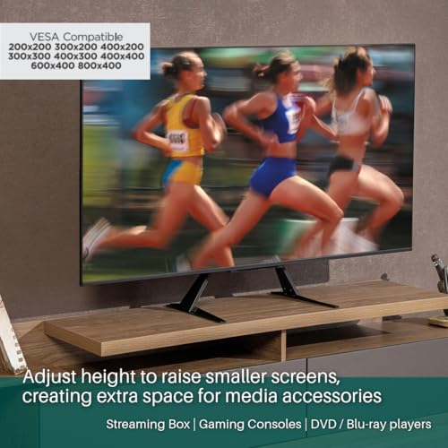 2 réglages de hauteur pour s’adapter aux écrans plus grands ou soulever les petits écrans des surfaces pour des accessoires tels que les lecteurs DVD/Blu-ray ou les décodeurs.