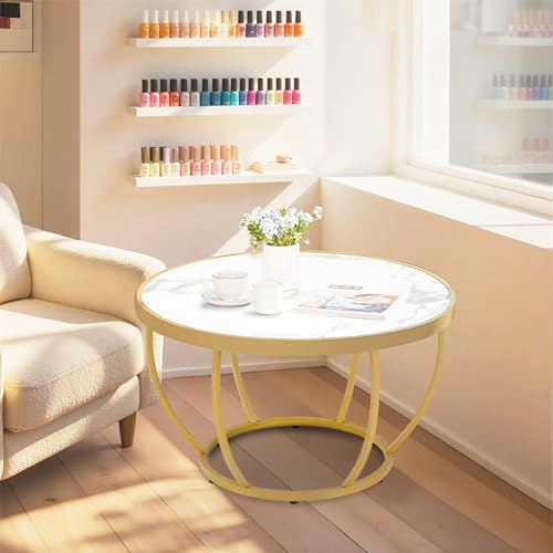 Barberpub table basse ronde en bois – Moderne – Métal – Marbre blanc doré – 80 x 80 x 46,5 cm – 2185