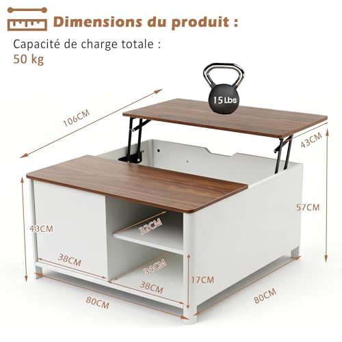 【MONTAGE RAPIDE】:Dimensions: 80 x 80 x (43–57) cm. Grâce à un kit complet et un guide illustré, assemblez votre table de salon en bois en moins de 30 minutes. Remarque : Veuillez soulever le plateau de table réglable en hauteur à deux mains pour éviter de l’endommager