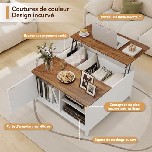 YU YUSING Table Basse Relevable Carrée 80×80 cm, Meuble de Salon avec Rangement Caché, Coffee Table Modulable en Table à Manger pour Bureau/Séjour, Portes Magnétiques, Design Moderne, Blanc et Noyer