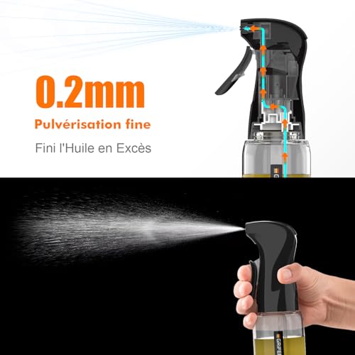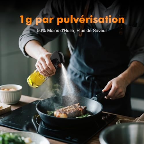 Le GRIFEMA Pulvérisateur d’Huile 200 ml en Verre est un accessoire de cuisine pratique et écologique, parfait pour l’huile, le vinaigre, les marinades et les sauces. Fabriqué en verre épais, sans BPA et sans odeur, il garantit une utilisation sûre et durable au quotidien. Son design ergonomique et son embout anti-gouttes permettent une utilisation facile et propre. La gâchette permet de délivrer un jet précis : choisissez une brume fine pour vos salades et sauces ou un jet concentré pour la cuisson, les grillades ou l’utilisation avec une friteuse à air. Chaque pression libère environ 1 g d’huile, pour un dosage exact et sans gaspillage. Facile à nettoyer, la bouteille est dévissable avec un tube amovible, compatible avec un lavage à la main ou au lave-vaisselle. L’embout se rince facilement à l’eau chaude ou au vinaigre, assurant un entretien simple et rapide. Polyvalent et réutilisable, il s’adapte à l’huile d’olive, aux huiles de cuisson, au vinaigre ou aux marinades. Idéal pour les salades, la cuisson au four, les barbecues ou l’Airfryer. Compact, léger et ergonomique, il permet une utilisation d’une main et réduit les éclaboussures pour une cuisine propre et pratique.