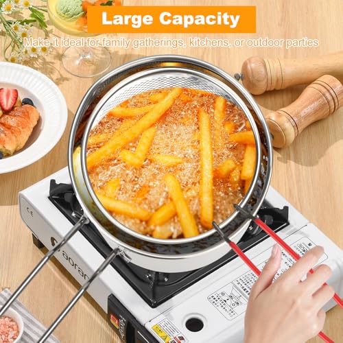 [Ensemble de Friteuse à Huile]: Cette friteuse en acier inoxydable 304 comprend un panier passoire intégré, une passoire en maille, une poignée extensible amovible et un couvercle. Ces accessoires filtrent efficacement les impuretés et la graisse, vous permettant de profiter de repas plus sains. La poignée extensible amovible empêche les brûlures et peut être retirée pour économiser de l’espace lors du rangement. Comprend également un sac en maille, des pinces alimentaires et une grille métallique pour une utilisation pratique en plein air et pour un rangement organisé.