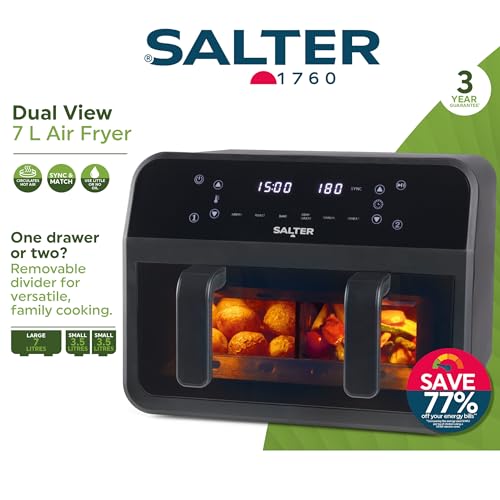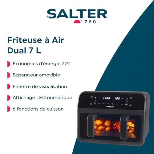 Salter Dual View Friteuse à air – Plaque de cuisson antiadhésive de 7 L avec séparateur amovible, grande capacité familiale, fenêtre de visualisation, numérique à LED, 6 fonctions, 2300 W