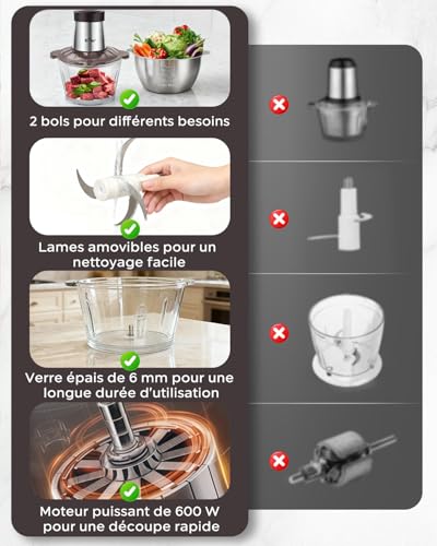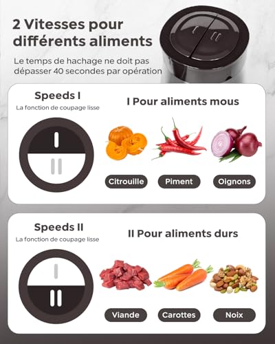 💪[2-Speed] Puissance du hachoir à viande 600W, peut facilement hacher, couper et mélanger une variété d’aliments en peu de temps, la vitesse 1 est adaptée aux aliments faciles à hacher tels que les légumes, les fruits, l’ail, les piments, les oignons ou les soupes froides. La vitesse 2 convient aux aliments durs tels que la viande, les noix, les carottes, le jambon ou le fromage.