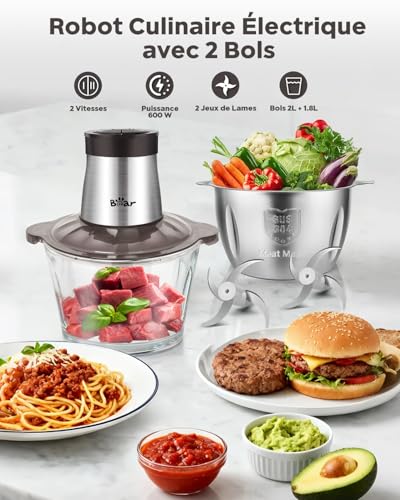 Bear 2L+1.8L Hachoir Électrique En Acier Inox, 600w 2 Vitesses, 4 Lames En Acier Inoxydable, Coupe Julienne Dans Un Récipient En Verre Pour La Viande, Les Aliments Pour Bébés, Les Fruits, Les Légumes
