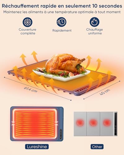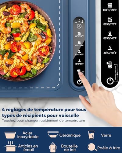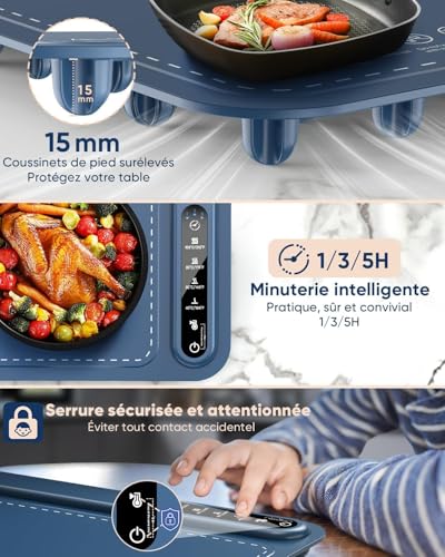 Chauffe Plat Electrique pour 4 Températures & Minuteur 1/3/5h, Plaque Chauffante Electrique Portable et Rapide, Chauffe Plat électrique pour Réchauffer,Décongeler,Maison et Fêtes