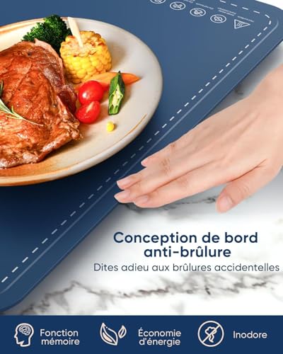 Design convivial : Le réchauffeur de chauffe plat est doté d’une structure innovante de dissipation thermique avec des pieds surélevés (15 mm) pour une meilleure circulation de l’air et une dissipation thermique plus efficace, protégeant ainsi votre plan de travail. Sa fonction mémoire enregistre les derniers réglages de température et du minuteur pour une utilisation facile et pratique. Le design de la bordure antibrûlure garantit une sécurité accrue – Dites adieu aux brûlures accidentelles.