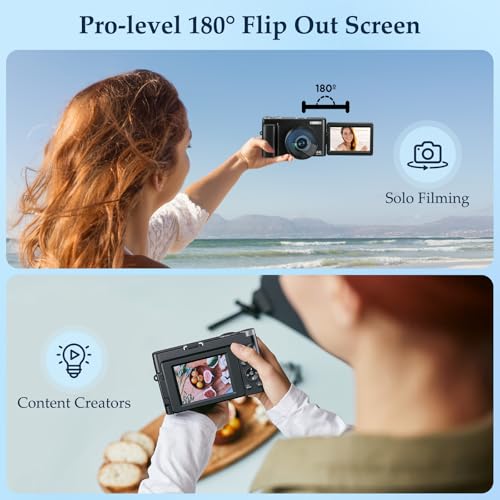 【Appareil Photo Compact avec Écran Orientable】Cet appareil photo compact de la taille de la paume ne pèse que 0,6 lb, facile à emporter. Son écran LCD de 3,0″ orientable vous permet de suivre l’enregistrement sous tous les angles. Avec deux batteries de grande capacité, il peut filmer toute la journée. Ce digital camera est parfait pour les selfies et l’enregistrement vidéo !