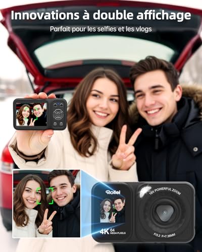 Rollei Compactline 64 Dual Screen appareil photo numérique avec qualité d’image 64MP, résolution vidéo 4K et zoom 18x, offre 2 écrans et des modes polyvalents, appareil photo selfie et vlog idéal pour les enfants, les adolescents, les étudiants, etc.