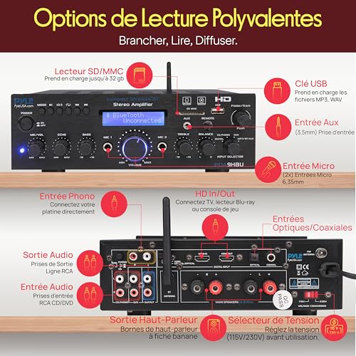 Pyle Amplificateur Bluetooth Stéréo sans Fil pour la Maison – Amplificateur Multi-Canaux 200W avec Récepteur Audio, HDMI, Optique/Phono/Coaxial, Radio FM, USB/SD, AUX,RCA, Entrée Micro- Télécommande