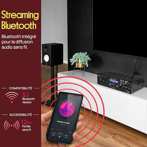 CONNECTIVITÉ BLUETOOTH : Le ampli Bluetooth stéréo est compatible avec une portéesans fil de plus de 12 m et fonctionne avec les appareils les plus récents, y compris lessmartphones, iPad, tablettes et ordinateurs portables avec un appairage facile.