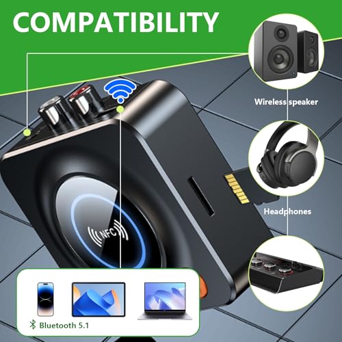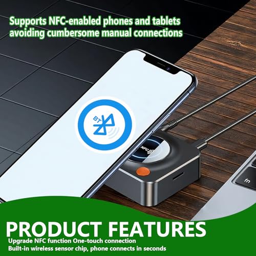 Recepteur Bluetooth RCA : à l’aide d’un câble RCA vers 3,5 mm, ce adaptateur audio Bluetooth peut recevoir l’audio AAC SBC et le transmettre à vos enceinte. Vous pouvez écouter la musique de votre téléphone sur des enceinte de haute qualité et vous promener en toute confiance à moins de 100 pieds, et il maintiendra une connexion Bluetooth stable. Fonction NFC : Si vous placez le téléphone portable dans la zone de détection NFC de ce produit après avoir activé la fonction NFC du téléphone portable, c’est pratique et rapide car vous pouvez vous connecter d’une seule touche (le téléphone portable doit prendre en charge le fonction NFC). Technologie Bluetooth 5.3 : Le récepteur Bluetooth C52 intègre la dernière puce Bluetooth Ver5.3 à faible perte d’énergie, qui est non seulement compatible avec les anciennes versions du produit, mais a également une distance de transmission plus longue et plus que Bluetooth 4.0. A une vitesse rapide. Spécifications du produit : Taille (6,9 * 6,9 * 2.4 cm), poids (45 g), port audio (NFC, emplacement pour carte TF, AUX 3,5 mm, RCA AUX), distance de réception (intérieur 10 m), tension d’entrée 4,8 V à 5,25 V. Configuration facile facile à utiliser : Connexion alimentation Vous pouvez vous connecter en entrant directement dans le mode d’appairage, en activant le Bluetooth du smartphone et en sélectionnant CB2.