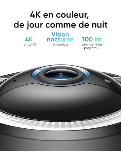 4K en couleur, jour et nuit: La caméra 4K en couleur vous permet d’identifier une plaque d’immatriculation à 10 mètres de distance avec un niveau de détail x4. Eclairez votre environnement avec un projecteur de 100 lumens, révélant des détails vifs et colorés jusqu’à 8 mètres de distance, la nuit.