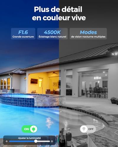 MODES DE VISION NOCTURNE MULTIPLES ET PERSONNALISATION FLEXIBLE : Passez aisément d’un mode de vision nocturne infrarouge ou couleur à l’autre et personnalisez l’activation du projecteur (déclenchée par un mouvement ou programmée) et la luminosité. Son ouverture F1.6 permet d’améliorer les performances de vision nocturne dans des conditions de faible luminosité.