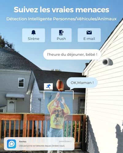 DÉTECTION DE PERSONNES/VÉHICULES/ANIMAUX : Dotée de technologies d’IA de pointe, la caméra Duo 2V PoE émet des alertes précises en temps réel, y compris des alertes par application, des alertes par e-mail , projecteurs et sirène. Elle prend également en charge l’enregistrement de clips de mouvement et leur téléchargement sur FTP.