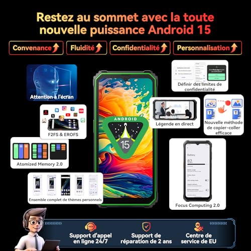 🌲【Android 15 Pré-adapté & Performances et Sécurité Réinventées】🌲Le Blackview BV4800 SE Smartphone Incassable est prêt pour Android 15, offrant une gestion intelligente de la fréquence de rafraîchissement (60Hz à 90Hz). Par exemple, réduisez automatiquement la fréquence lors de la navigation web pour économiser la batterie, ou activez un flux haute fréquence pour les jeux et vidéos, combinant fluidité et autonomie optimisée. La mise à niveau protection de la vie privée et la gestion de batterie pilotée par IA renforcent la sécurité des données et l’endurance.