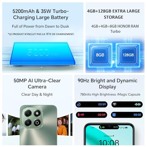 HONOR X6b 4G Smartphone 4Go 128Go, 6.56″ 90Hz TFTLCD, 5200mAh Batterie, 50MP Appareil Photo Principal, Android 14, Dual Sim, NFC, Vert