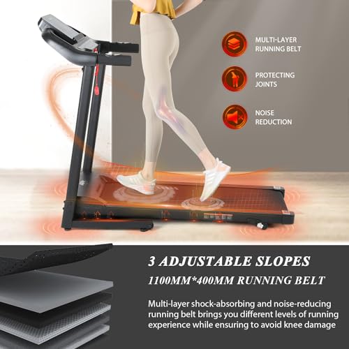 🏃Le tapis roulant électrique pliable dispose d’une ceinture de course de 1100mm*400mm, la surface du tapis roulant électrique inclinable est composée d’une protection multicouche et de ceintures de course antidérapantes pour protéger vos articulations des impacts pendant l’exercice. Et une clé de sécurité assure la sécurité de vos exercices. Évitez les blessures accidentelles. L’angle d’inclinaison du tapis roulant peut être réglé manuellement grâce au bouton-3 angles d’inclinaison.