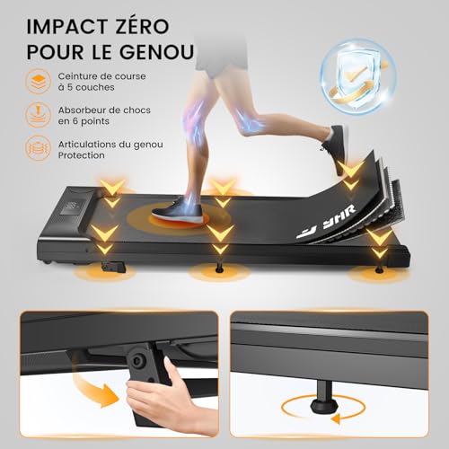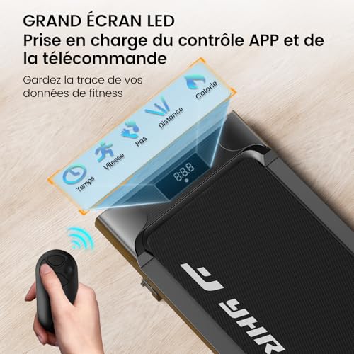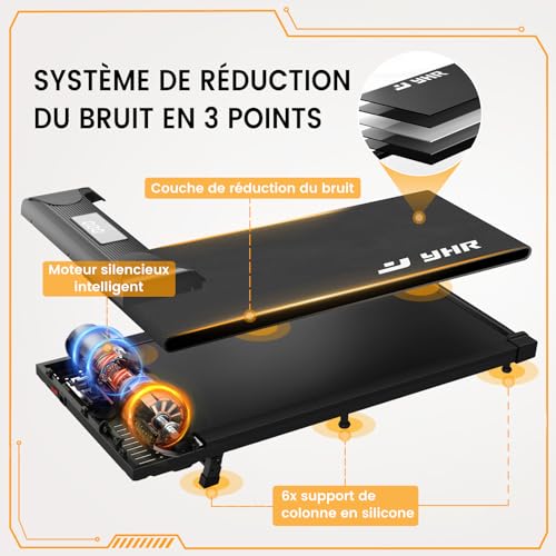 Moteur silencieux et puissant de 2.5 HP : Équipé d’un puissant moteur silencieux de 2.5 HP, ce tapis de course pour le bureau ou la maison réduit le bruit, rendant vos séances d’entraînement plus silencieuses et plus stables